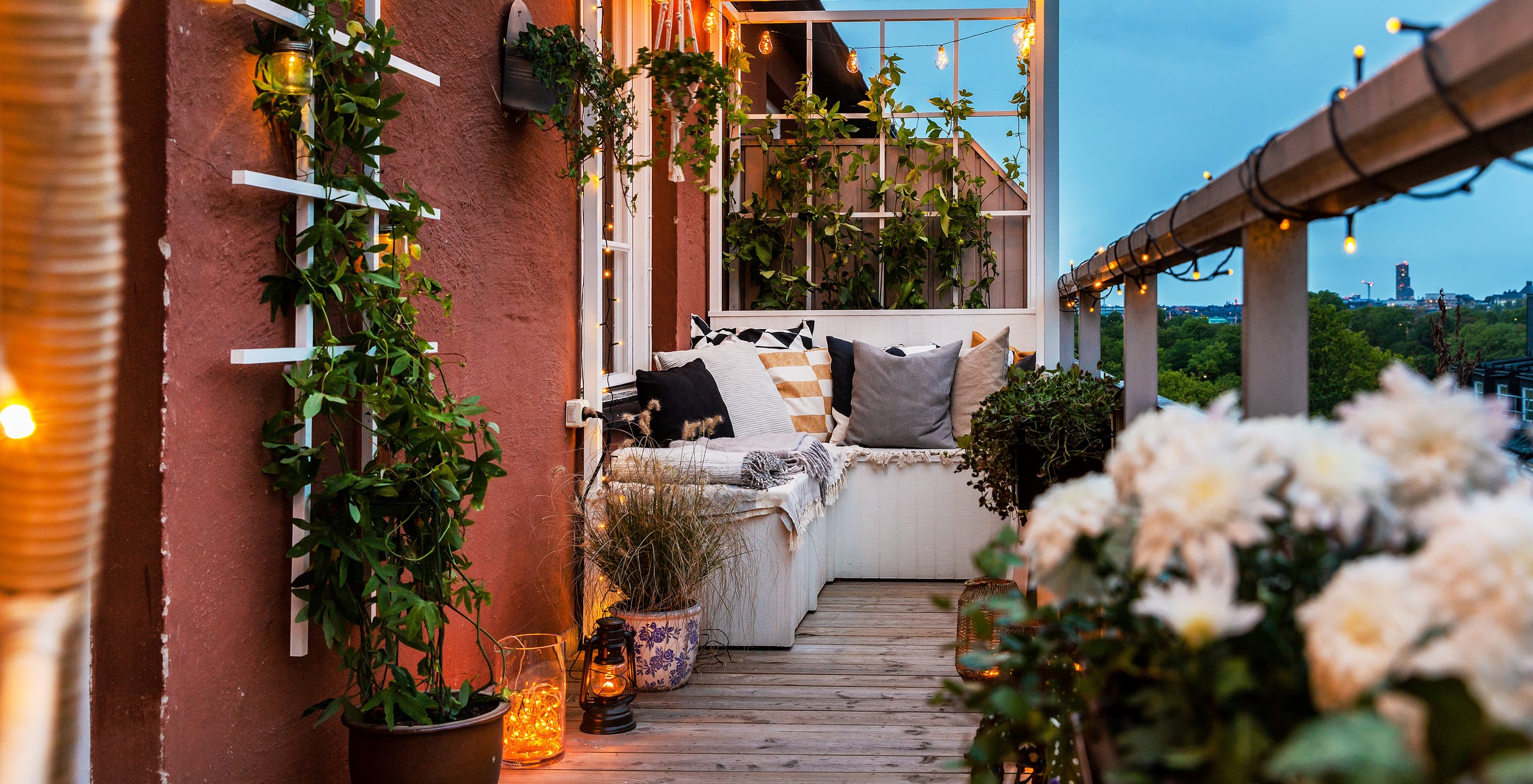 - Arkitektritad balkong med pergola och trätrall samt en unik soffkonstruktion med lounge- middags- eller solbäddsläge.