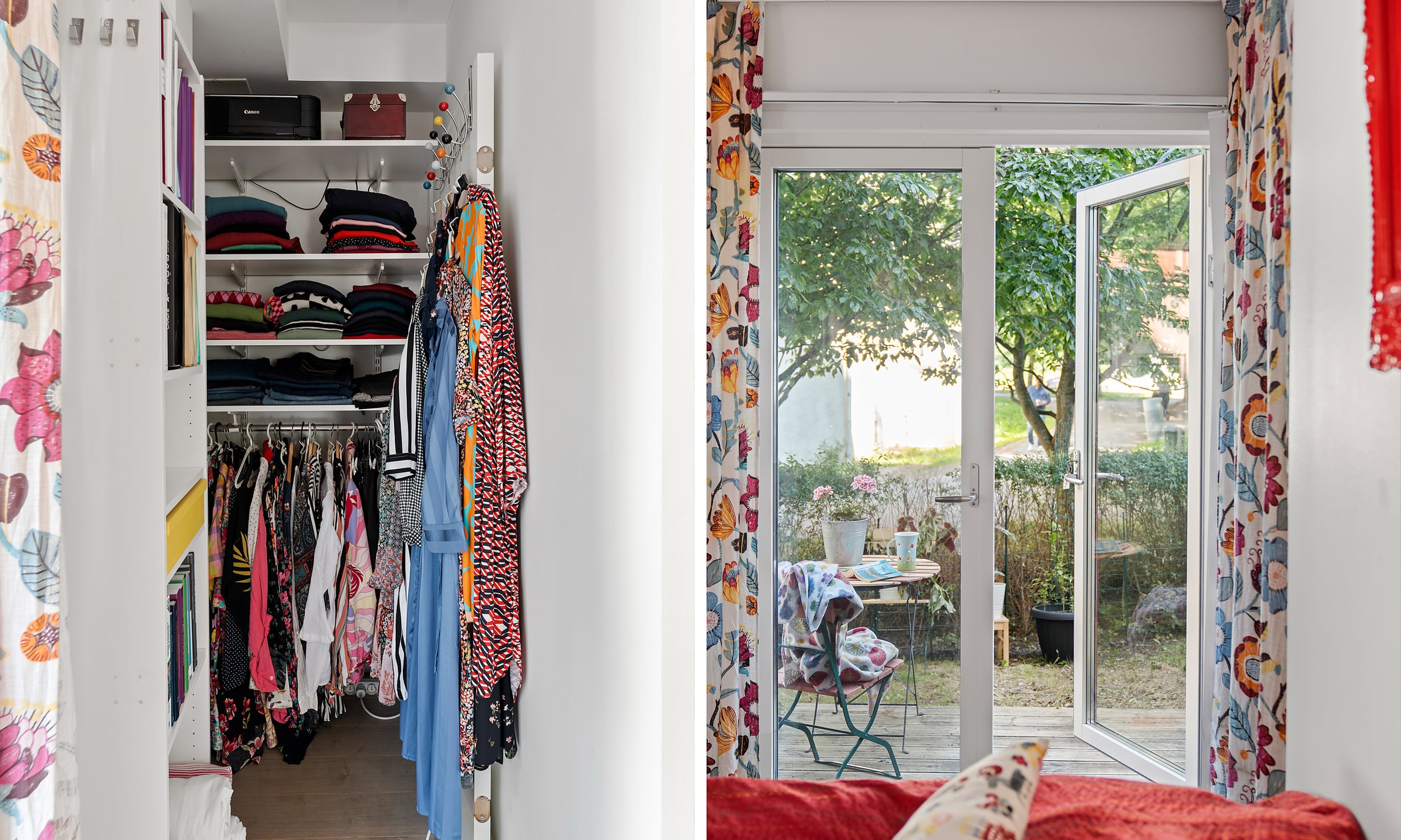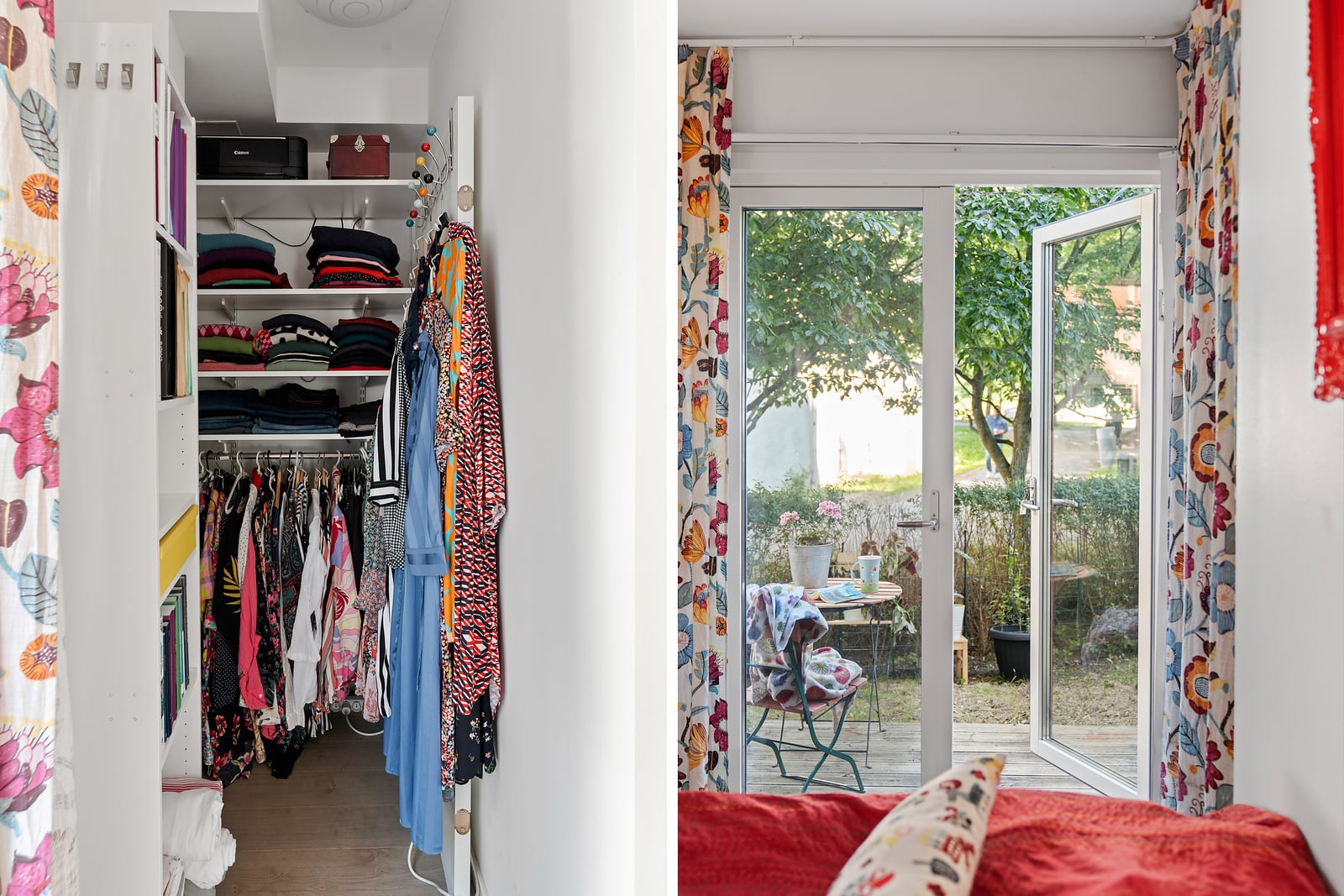 Utgången till uteplatsen förstärker den sociala känslan i lägenheten och möjliggör flera sittavdelningar. Uteplatsen har en vacker sjöglimt. Sovrummet har plats för en dubbelsäng och extra förvaring.