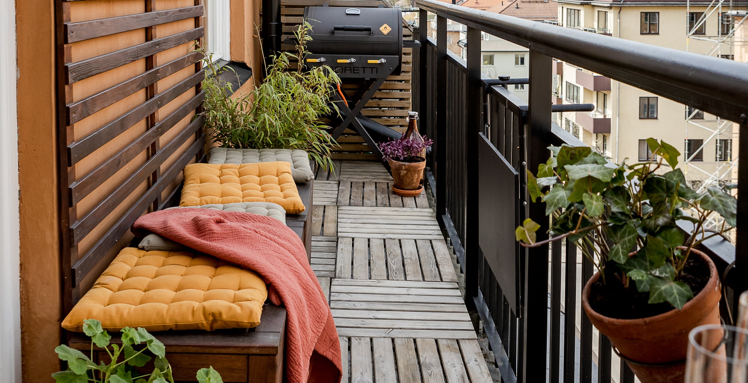Balkongen med kvällssol mot Verkstadsgatan sträcker sig utmed hela vardagsrummets bredd och är möblerbar med plats för både bord, stolar och grill.