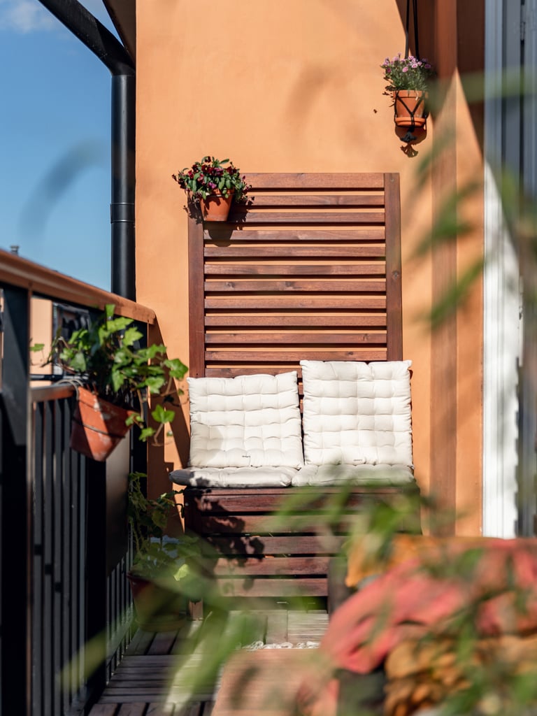 Balkongen sträcker sig utmed båda sovrummens bredd och har ett högt och lugnt läge mot gårdens stora och lummiga träd. Här finns en platsbyggd solbädd och solchans från förmiddag till sen eftermiddag.