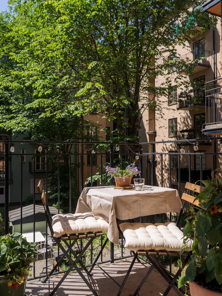 Matrummet förstärker den sociala planlösningen mellan köket och vardagsrummet. Det ger möjlighet till ett stort sällskapsrum med flera sittavdelningar, särskilt när balkongen är uppställd. Balkongen har utsikt mot föreningens grönskande gård i sydvästläge, vilket ger sol långt in på sena eftermiddagen. Det är en lugn stadsoas med livliga Swedenborgsgatan och Mariatorget precis utanför porten.
